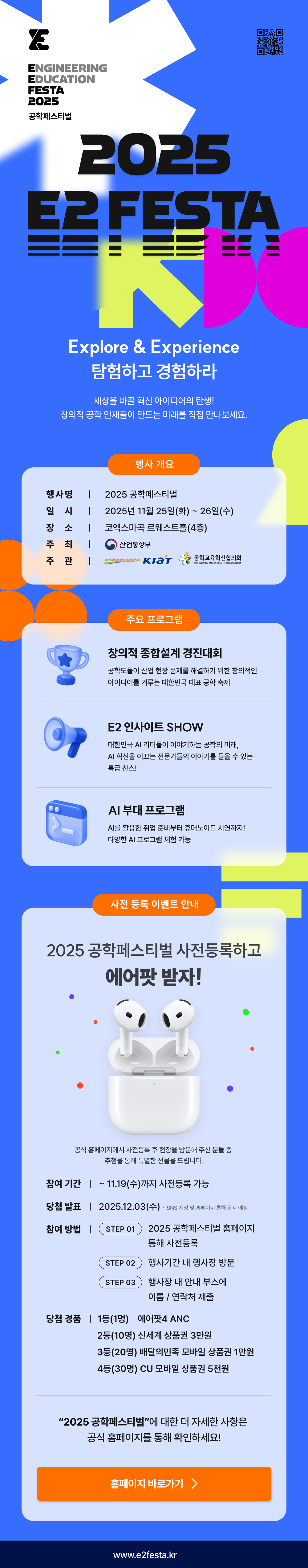 공학교육혁신센터에서는 “창의융합형공학인재양성지원사업(산업통상자원부, 한국산업기술진흥원)”일환으로, 공학 인재들의 성과를 공유하고 산업계와의 소통을 촉진하는 2025 공학페스티벌을 다음과 같이 개최하오니, 관심있는 학생들의 많은 참여 바랍니다.