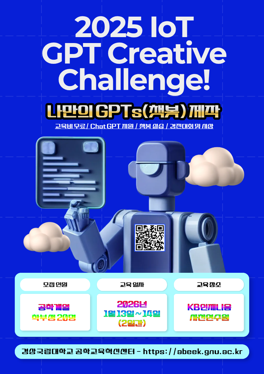 공학교육혁신센터에서는 공학계열 학부생 대상으로 나만의 GPTs(챗봇) 제작을 통한 창의적 문제해결 역량 강화 목적으로 (동계)2025 IoT GPT 크리에이티브 챌린지 프로그램 참가학생을 모집하오니 관심있는 학생들의 많은 참여 바랍니다.