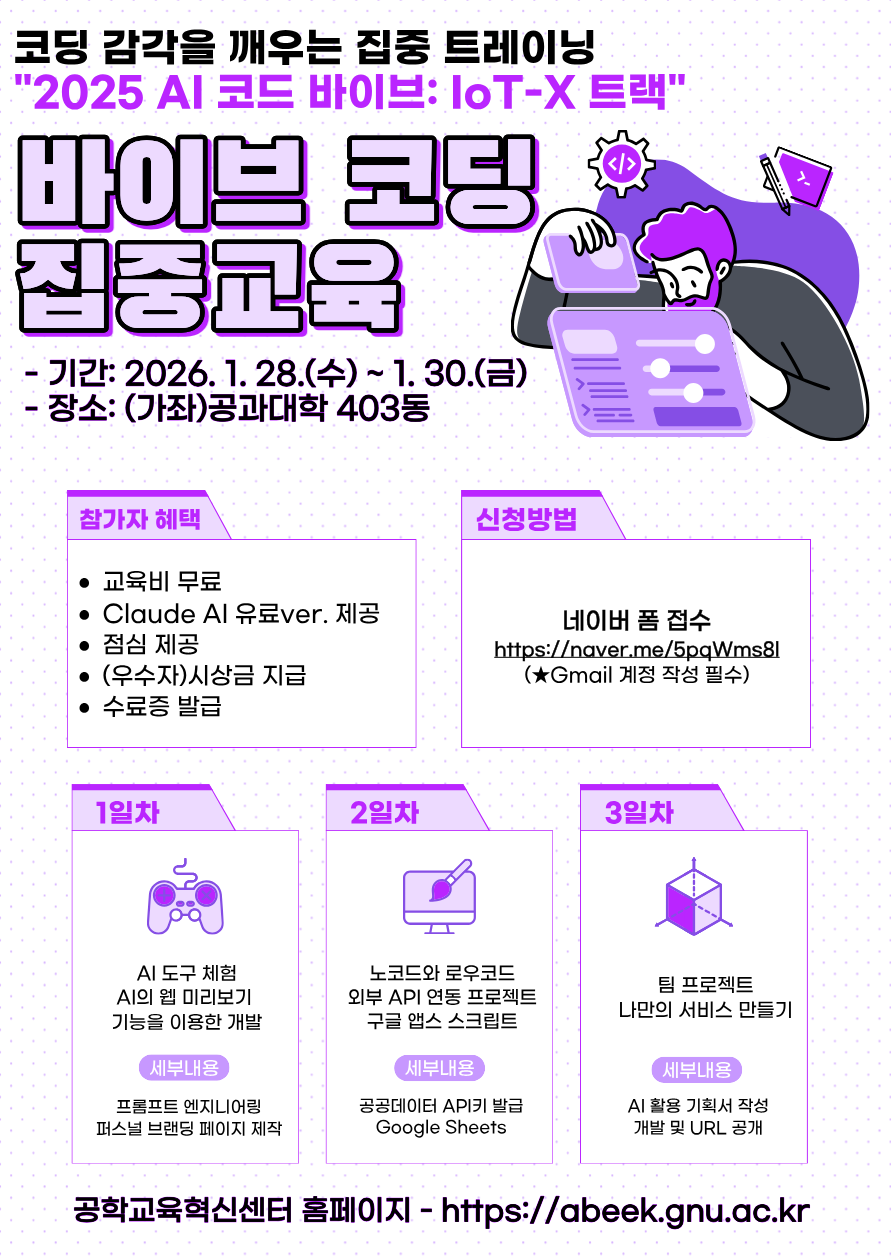 공학교육혁신센터에서는 공학계열 학부생 대상으로 코딩 진입장벽 완화 및 AI 협업 능력 함양 목적으로 2025 바이브 코딩(Vibe coding) 집중교육 프로그램 참가학생을 모집하오니 관심있는 학생들의 많은 참여 바랍니다.